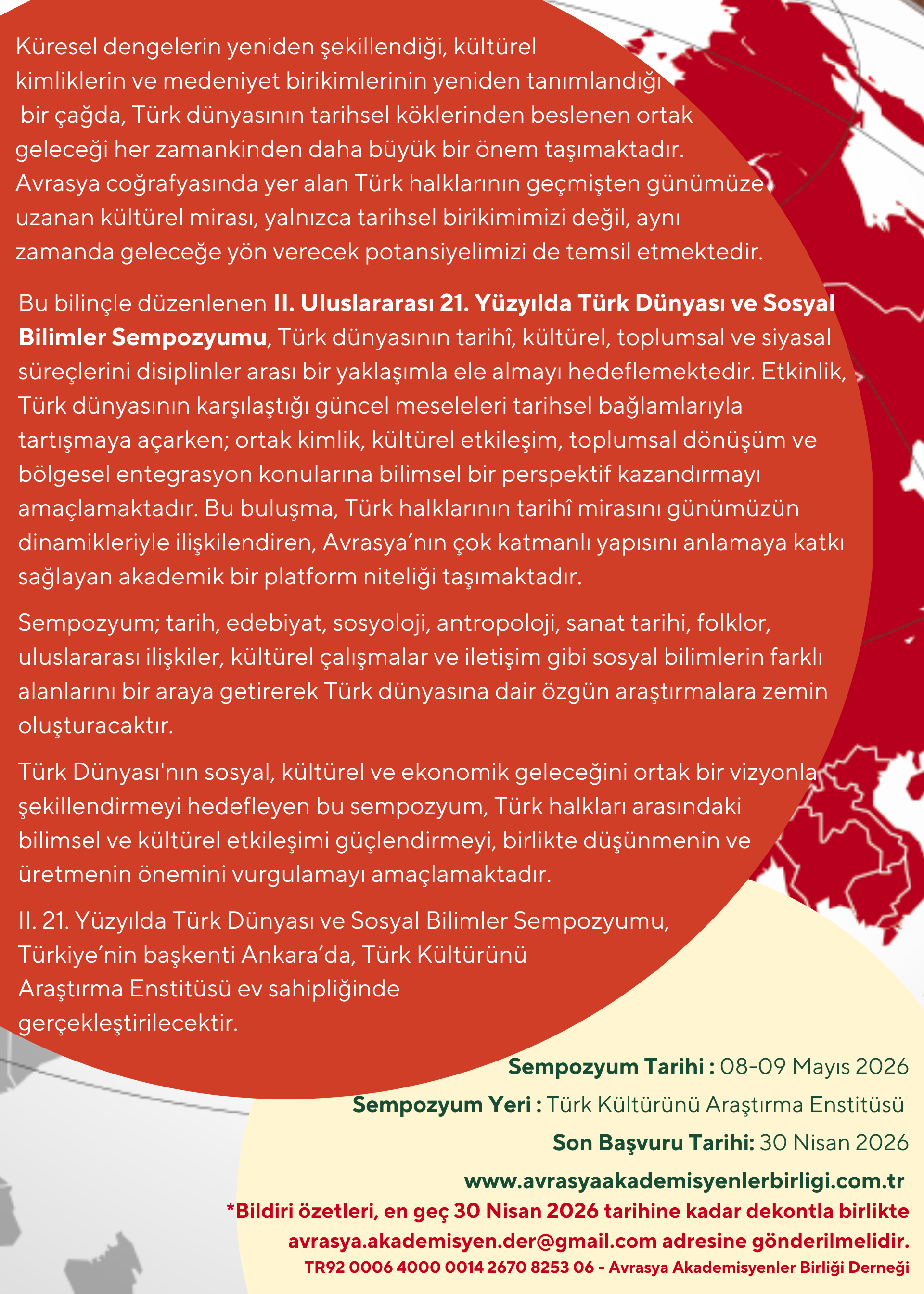 Avrasya Akademisyenler Birliği Derneği tarafından düzenlenen "II. Uluslararası 21. Yüzyılda Türk Dünyası ve Sosyal Bilimler Sempozyumu", Türk Dünyası’nın mevcut durumunu ve geleceğini ele almak amacıyla Ankara'da gerçekleştirilecektir.